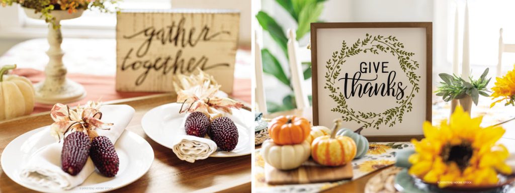 Transition your base display into a Thanksgiving look with turkey-motif décor on your side table, baskets of dried corn cobs, and lots of fall candles. Change out the pillows and throws and add some seasonal signs that say “Give Thanks” or a similar sentiment.