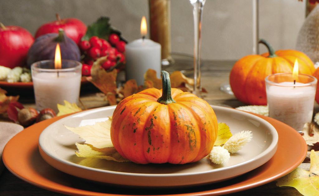 Finish the tablescape with pumpkins and gourds and a scattering of faux leaves. Fill the china cabinet with warm kitchenware and cozy fall textiles. Going forward, tweak your table by adding turkey and Thanksgiving décor.