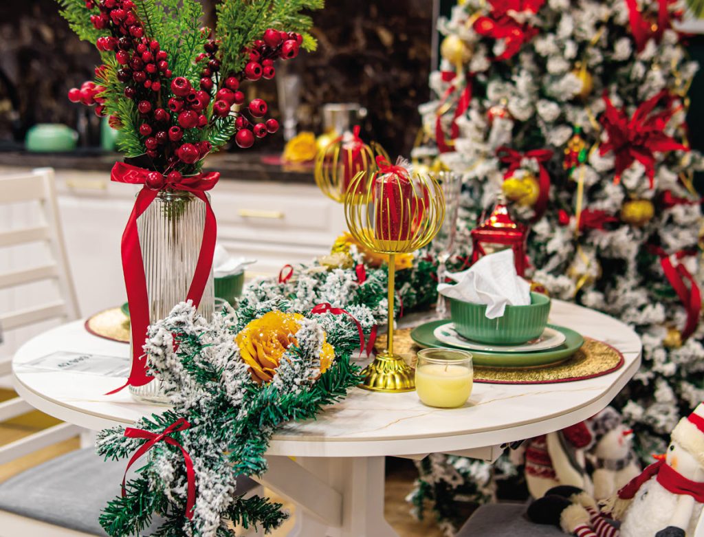 Transition your display into Christmas by swapping out the throw rug for a holiday one. Clear the table and create a holiday scene complete with rolls of colorful wrapping paper, gift boxes, and ribbons and bows. Feature some of your best giftware on the table as if someone is actively wrapping gifts. The key here is to create a bit of controlled chaos.