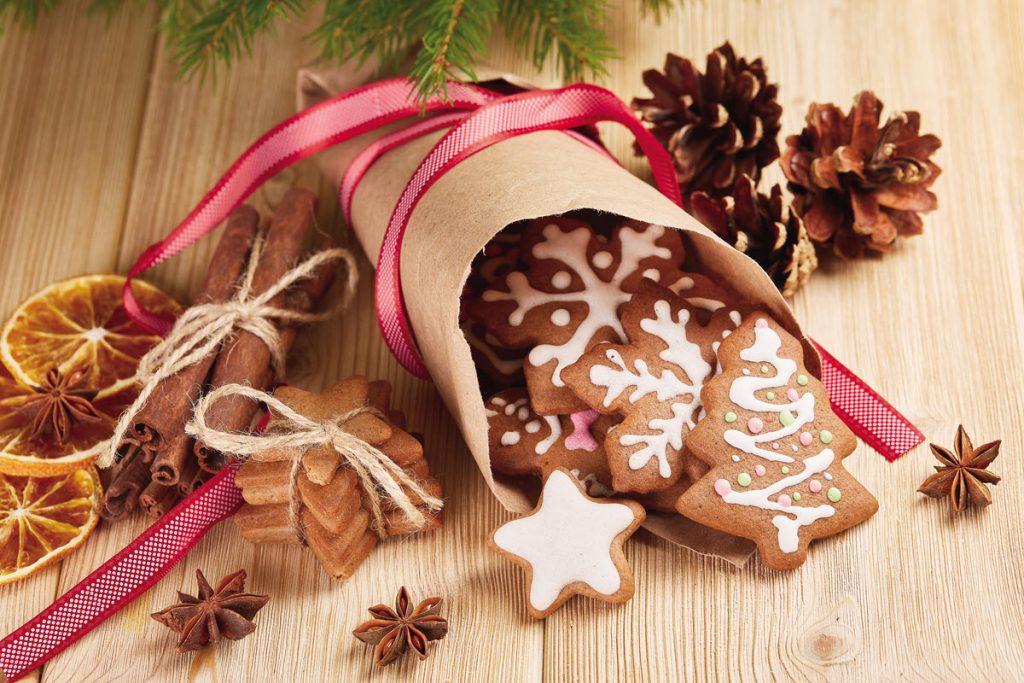 Move straight into Christmas by removing all the fall leaves but leave the bare branches. In front of the branches, place various sizes of faux evergreen trees bedazzled with tiny lights and ornaments. Add bright Santa and snowman pillows to the chairs, along with Christmas mugs and other gourmet food items you carry for the holidays such as hot cocoa mix, holiday candy, and nuts. Complete the look with some piles of wrapped gifts and finish with a dusting of faux snow over the entire scene.