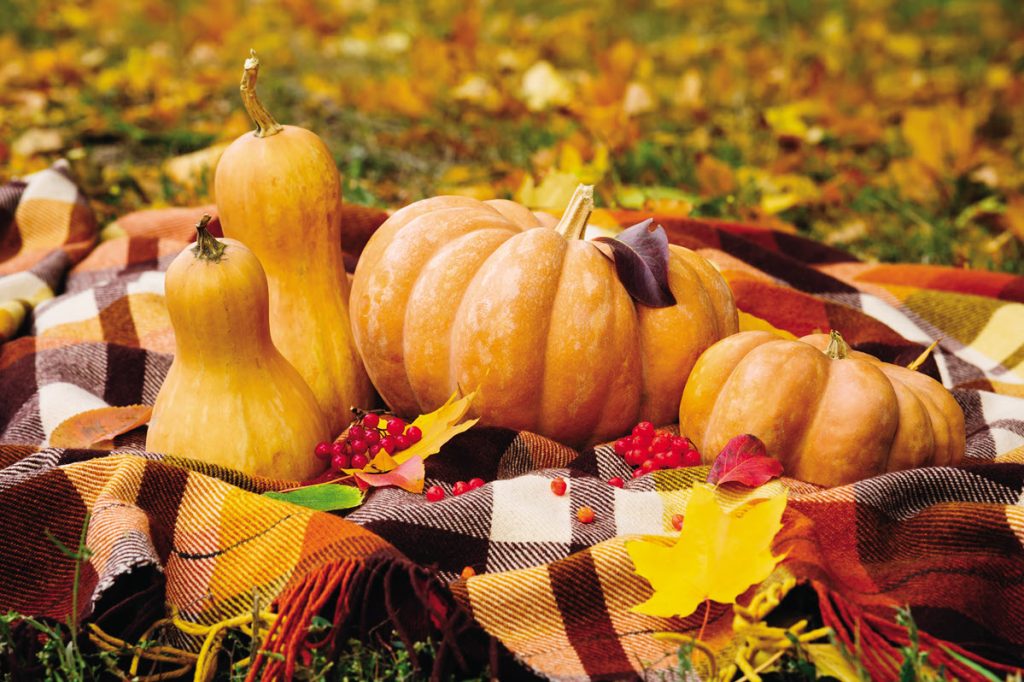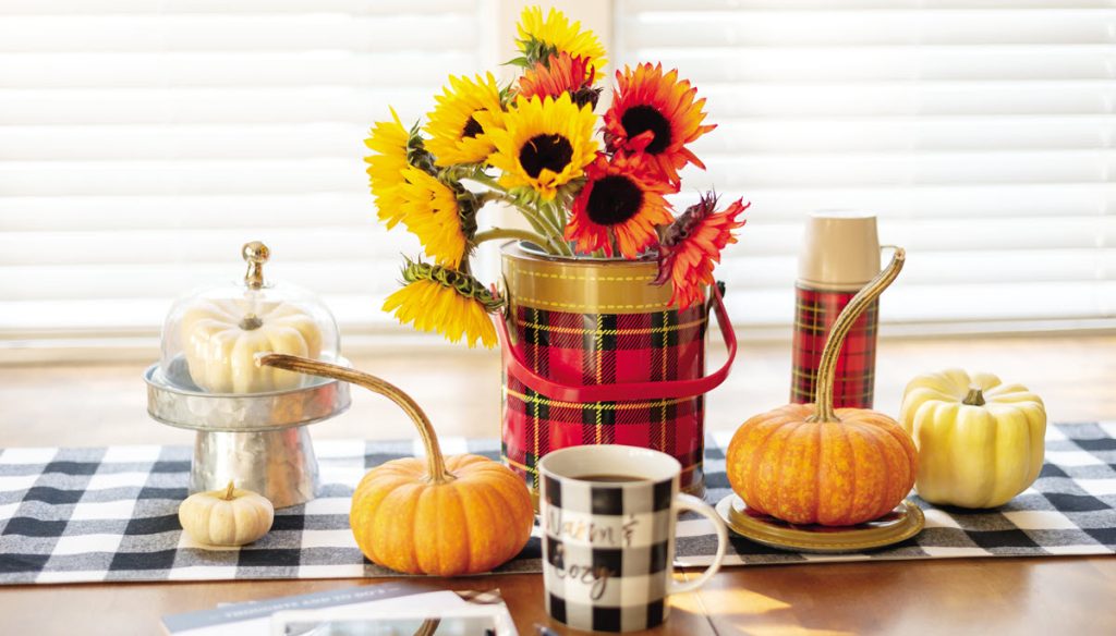 Finish the tablescape with pumpkins and gourds and a scattering of faux leaves. Fill the china cabinet with warm kitchenware and cozy fall textiles. Going forward, tweak your table by adding turkey and Thanksgiving décor.